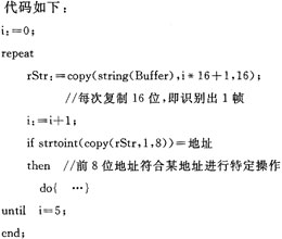 由于单片机的SPI口对VSC8228进行控制时须向每个寄存器发控制字,所以界面就要求发送1个地址加1个字节数据的形式,这样就有16位;同时为单片机能够方便地分清每个帧(1字节地址加1字节数据),每次发送1帧就延时100 ms。单片机每秒扫描1次VSC8228的全部寄存器,并将数据传送给界面,因此,界面首先要一帧一帧地识别出来,然后对于某些地址的数据进行特定的操作。