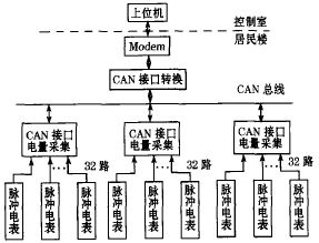 系统由以下部分组成:脉冲电度表、电量采集器、CAN转换器、调制解调器、上位机。系统的结构框图如图1所示。