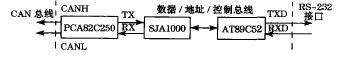为了实现单片机与上位机的通信,设计了TTL电平与RS-232之间转换的接口,如图5所示。AT89C52本身不含控制器,所以采用了CAN控制器SJA1000和CAN驱动器PCA82C250。