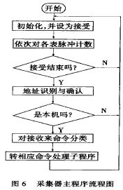 主要对采集器主程序的设计作简要说明。它包括初始化与数据采集处理两部分。初始化程序包括对8259A初始化。在数据采集部分,采集器主程序采取循环采集数据的方式,并对接受到的命令进行分类,然后转相应的命令处理子程序。主程序流程图如图6所示。