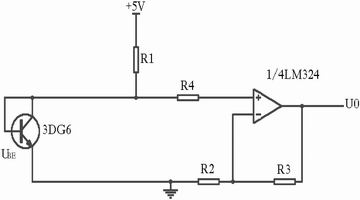 用3DG6作为温度传感器,LM324运算放大器构成的测量放大电路见图1。晶体管3DG6置于测温现场其接成基极与集电极短路即发射结正偏,集电结零偏作为二极管使用来用作温度传感器,电源通过电阻R1(100K)向3DG6提供约45mA的集电极电流。其UBE连接到LM324的同相端,R1,R2,R3,R4均为普通金属膜电阻,选R2=R3则放大器输出U0≈2UBE。本仪器用2片LM324可同时检测7路输入信号。