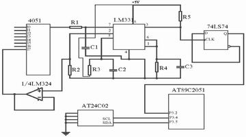 检测与处理电路见图2。图2中4051为八选一模拟开关,其输入I0"I6为温度检测输入,I7为自动补偿输入。放大器LM324接成跟随放器,其输入为LM331芯片2引脚输出的VREF电压。LM331为电压/频率转换器(V/F),其输出经74LS74分频后连到单片机AT89C2051的P3.2端,由单片机检测脉冲宽度并通过运算得出对应温度值。AT24C02为串行I2C总线EEPROM电路,用来存放调校时两基准温度值所对应的脉冲宽度和LM331基准电压VREF所对应的脉冲宽度。