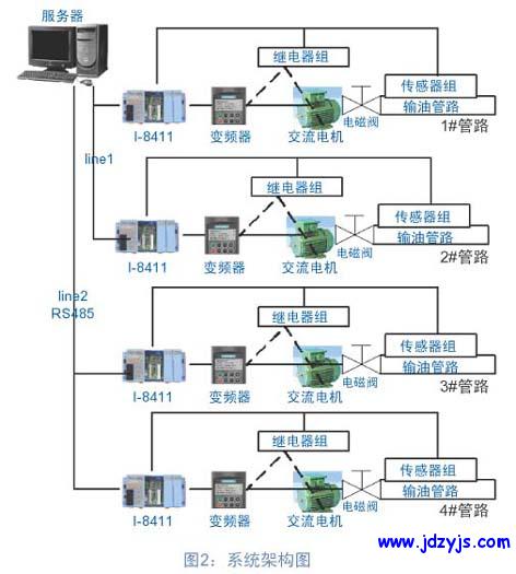 在小型石油公司中,要进行大量的油料计量工作如轻油、0#汽油、90#汽油等,其计量过程往往是车队从货运站拖回公司后经公司磅房过磅称毛重、卸料、车辆出厂时,再过磅称车重等等,过磅过程、手续、登记极其繁琐,有时还容易出现错磅和漏磅现象,极不容易管理,并且给统计、计量工作带来了极大的困难,过磅工人的劳动强度大,经常出现车队排队过磅的现象,办事效率极其低下,为改变这种局势,采用PC-Based PLC I-8411嵌入式控制,并配以模拟信号输入模块I-8017H、模拟信号输出模块I-8024、光隔离数字输入/输出模块I-8042、I-8060继电器输出模块以及RS232/RS485转换器I-7520,并利用计算机控制技术,为其不同的油料的进站计量、出站计量、统计等开发了一套分布式的油料计量、统计管理系统,省时又省力,深得用户喜爱。系统架构图件图2所示。