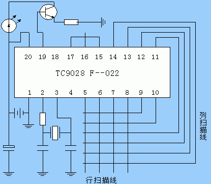 微处理器TC9028 F--022 芯片的功能比较简单,一是键盘扫描,识别键位,二是键功能编码,向输出端口提供编码数据。当有键按下时,微处理器TC9028 F--022 扫描键盘,识别出是哪个按键后,进行功能编码,从19脚输出,经Q1501驱动,使D1501发出红外光,向外发射传输数据。