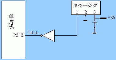 TMFS—5380是红外线遥控接收器,当内部的光电二极管接收到红外光时,光电检测电路将光电流转换为电压信号,电压信号被放大后,被带通滤波器选出已调信号,经检波,取出编码脉冲,从1脚输出。红外线遥控接收器与单片机的接口电路,仍采用TMFS—5380,它与单片机的连接如图三所示。