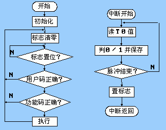 遥控接收电路1脚输出的是串行脉冲信号,可以让此脉冲触发单片机的外部中断INT1,设置定时器T0工作于方式0,当中断到来时,给T0置初值0,然后启动T0,当下一次中断到来时,读出T0的值,根据值的大小就可以判断脉冲的宽度,即可判断出是“0”,还是“1”。程序方框图如下所示。