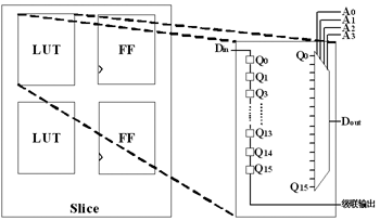 SRL16E是一种基于查找表的移位寄存器,可以非常方便地配置成多个触发器级联输出的形式,因此应用SRL16E来实现PN序列,是非常高效的,并且能够很大程度地减少FPGA资源的占用。原先SRL16E由于在配制时需要注册而被认为比ASIC(Application Specific Integrated Circuit,特定用途集成电路)开销更大。现在,它已成为FPGA中LUT(Look Up Table,查找表)配制模式的基本单元,可以非常方便地应用。并且这些基本单元在设计中应用得越多,那么设计所占用的专用触发器资源就越少。如图2所示为Xilinx公司Virtex II系列FPGA中的基本Slice结构示意图。