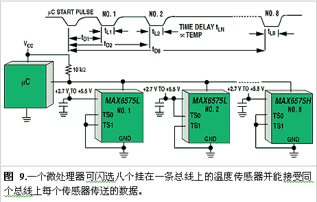 图9为一个实际中的应用情况,允许八个温度传感器连在同一个总线上。当微处理器的I/O口同时选通总线上的传感器时,就开始从这些温度传感器读取温度的过程。为了从每一个传感器中接受数据微处理器快速的调配接口以满足输入条件。在传感器选通后,微处理器即对读入的数据进行译码。每一个传感器都在特别范围的时间内选通脉冲到来时译码。通过分配给每一个传感器传数的时间范围,就可以避免译码冲突。
