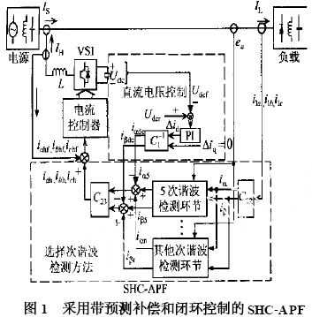 如图1 所示, 带预测补偿的SHC-APF 采用了带预测补偿的选择性谐波检测方法以及基于该检测方法的电流和电压的闭环控制。其中, 带预测补偿的选择性谐波检测环节直接检测出任意指定次谐波;电流的闭环控制使得输出的补偿电流可以精确地跟随给定的补偿电流信号; 电压闭环控制使SHC-A PF 中V S I 的直流侧电容电压控制在指定的电压值, 从而保持V S I 的交流侧与电源之间的电压差。