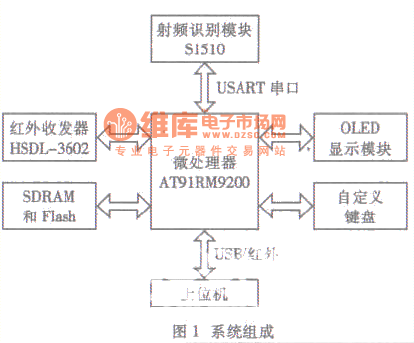 系统采用Atmel 公司的AT91RM9200 32 位高性能处理器、TagMaster 公司的S1510 及Oled显示模块等实现电子标签卡信息的采集、处理、实时显示及与上位机通信等功能。系统组成如图1。