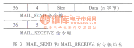MAIL 命令方式通信也就是把帧中的MESSAGE 域统一成四种格式, 其中命令帧有MAIL_SEND 和MAIL_RECEIVE两种,分别表示S1510 接收用户信息和返回卡信息(包括卡号、卡状态和卡存储的数据), 如图3。
