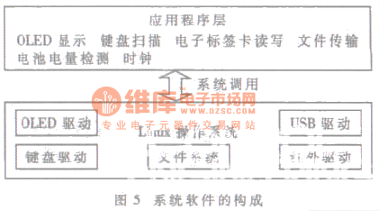 系统软件是整个系统的灵魂, 其设计的好坏直接影响系统的稳定性和可扩展性等性能。系统设计将软件分为两层结构, 如图5所示。最下面一层为操作系统层, 主要实现对Linux 操作系统的移植和各种设备驱动程序的编写, 包括OLED 模块、USB? Device、红外、键盘等设备驱动程序。上一层为应用程序层, 主要实现卡信息显示、键盘扫描、电子标签卡读写、文件传输、时钟以及电池电量检测等功能。