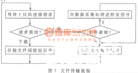 文件传输是一个进程, 完成卡信息的上传及其他数据的下载。与上位机通信采用Clinet/Server 模型。该进程实质上是一个服务器端(本系统) 的应用程序, 它循环等待客户端( 上位机) 的连接请求。当请求到达时, 首先判断请求来自哪个接口(USB 或者红外接口),然后根据请求的类型执行相应的上传或下载。考虑到实际应用中可能会使用多台手持式阅读器, 为了方便上位机对信息的管理,规定文件名由手持式阅读器编号和文件上传序号组成, 程序在上传文件时自动将其编号及上传序号加入文件名。该进程的流程 如图7。