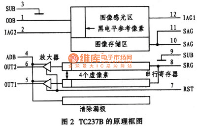 TC237B由4个基本功能模块组成:图像感光区、图像存储区、串行寄存器和带有电荷检测及独立复位的低噪音信号处理放大器模块,其原理框图如图2所示。