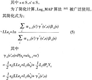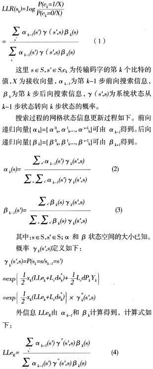 Turbo码有多种译码算法,基于Bahl-Cocke-Je-linek-Raviv(BCJR)算法的MAP译码是最为广泛应用的一种。MAP算法可以通过系统信息和外信息来获得对一个比特良好的概率估计,其译码输出的信息可以作为外信息由其他译码器在下一次迭代过程中使用。经过一定次数的迭代运算之后,对外部信息的运输结果收敛时,译码器盼陛能逼近香农限。