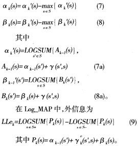从(9)式可知,LLek的值取决于{αk-1(s′)}中的最大值和{βk-1(s′}中的最大值。如果编码器的输出为dsk=+1且译码器的估计正确,则LLek为正。如果编码器的输出为dsk=-1且译码器的估计正确,LLek为负。LLek的绝对值越大,第k步估计为正确估计的概率越大。如果LLek最大值与次大值之差越大,LLek会越快收敛于正确估计。因此,译码的关键在于得到最大信息的状态,而状态信息的绝对值不影响结果,即这个最大值是否为0并不影响结果。
