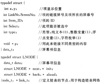 屏幕项组成:显示信息(如显示位置、类型、内容等)和链接信息(此项所链接的屏等)。综合各方面的需要,设定主要相关数据结构如下: