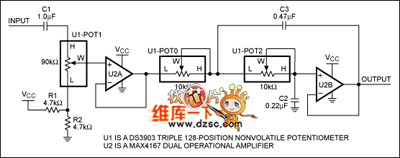 更改电容或选择不同端到端电阻的数字电位器,该电路的截止频率可以设置到500kHz。
