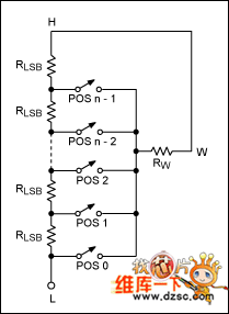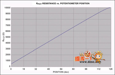 数字电位器的端到端电阻和滑动电阻具有较宽的公差,图1所示电路中的两个电阻(POT0和POT2)则保持相等,因为这两个电阻制作在同一硅片上。电位器的实际阻值差别较大,通常端到端电阻的变化范围是±20%,但它们的相对值基本保持稳定。