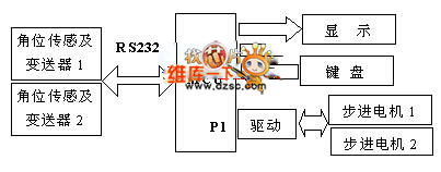模型姿态即攻角α和侧滑角β的测量控制如图2所示。所选用FB900C系列角位传感器及变送器其本身为一单片机系统,与系统单片机采用串行通讯。工作过程为通过键盘设置α和β角度,通过角位传感器和变送器测量系统当前角度,计算出要转过的角度,控制两个步进电机转动并送显示。