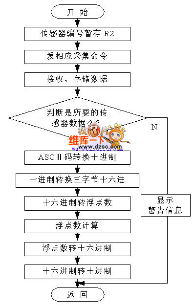 程序首先从累加器中取得要测量的方向,并把该方向存放在R2中,若R2的值错误,程序直接返回不进行任何操作。通过串口取得相应方向角位置数据后,调用进制转换程序将数据转换为浮点数,此时对R2中的方向值进行判断,获得该方向上的传动比,计算结果转换为十进制后也通过判断R2中的方向值获得数据存放的单元地址。