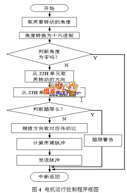 和角度测量相似,模型姿态需要改变的角度放在累加器中,需要改变的方向放在22H单元中,符号放在23H单元中,通过计算得到驱动模型转动给定角度所需要的脉冲数,以及该方向电机的控制端口。
