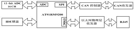 在处理器丰富资源的基础上,本装置对其进行了相关的配置和扩展,将处理器通过16路12位ADC接口对机电设备的电压或电流信号进行采集,IDE接口外挂大容量IDE硬盘,用于存储web、采集的数据等。通过DM9161芯片,该微处理器把EMAC接口外扩为以太网接口RJ45,与工业以太网连接。AT91RM9200通过SPI接口连接CAN控制器SJA1000,CAN控制器与CAN收发器PCA82C250相连,用于连接DeviceNet。硬件结构如图2所示: