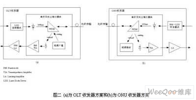 目前无源光网络(PON)已成为光纤到户FTTH(Fiber to the home)主要的网络结构。系统从OLT到ONU为下行方向。下行通信时用TDM模式把所有的数据包汇成一个数据流,通过光纤采用广播方式传送。在接收端,用户以适当的地址选择获得其所需的数据包。上行通信(从ONU到OLT)是相当困难的,因为多个用户都用同样的光纤进行传送。在任何时刻只允许一个用户能传送数据包到OLT。TDMA协议可用来保证上述的条件。也就是要求ONU在没有传送信号时处于关断状态,而在传送信号时要很快打开,这就时需要ONU支持特殊的突发模式发射器与接收器。因此,上行接入是系统设计的关键,而支持突发模式的收发器也就成为整个系统的重点和难点。