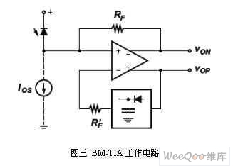 此电路是如何消除输出偏移电压的?现在我们先不管电流源IOS,当突发信息到来之前,峰值检测器被复位到放大器的两个输出端都输出共模电压。此时差分输出电压为0V。然后,突发的第一位“1”到达, VOP上升而VON下降。Vop的峰值存贮在峰值检测器内并反馈到放大器的输入端。当下一个“0”位到达时,峰值检测器的电压值会出现在VON输出端。因为RF’上没有电压降(没有输入电流),没有电压跨接在放大器输入端上,而且也没有跨接在RF的电压降(没有光电流)。因此,二个输出信号的峰值是相等的即输出偏移(output offset)就消除了。这种突发模式TIA的差分跨阻大约为2·RF。