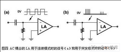 2. 突发模式LA和连续模式LA有什么差别?图四(a)示出单边连续模式LA,其输入信号通过交流耦合网络。数据信号被AC耦合网络的平均直流削波。因为连续模式信号是DC平衡的,其平均值相应于在眼图的垂直中心。假如我们用AC耦合来处理突发模式信号,如图四(b)所示的那样,其削波水平依旧是在信号的平均电平之上,但现在的眼图垂直中心部分会出现许多误码、脉宽畸变以及一些不合需要的后果。