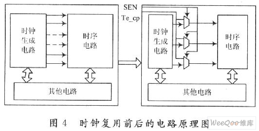从图中可以看出,时钟电路产生很多不同频率的时钟以满足不同模块的需求,在时钟电路的输出端口加入相应的选择器(MUX)控制时钟的选择;当处于正常工作状态时,MUX选择正常的时钟进入相应的模块,进而实现相应的功能;当处于扫描状态时,这些MUX都是选择同样的扫描测试时钟信号(Te cp)进人到各个模块进行测试。这样做的优点在于不仅满足了测试选择的需要,而且也尽可能地测试到所有触发器,满足测试覆盖率的需要。