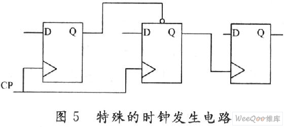 在本设计中存在很多特殊的电路,其中有一种时钟发生电路是不能进行扫描路径法的可测性设计,具体的电路图如图5所示。