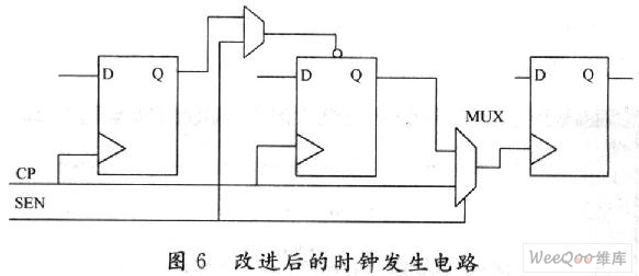 改进此种电路结构的方法是手动或者用软件方式增加一个MUX选择器,当在扫描链插入时,正常的控制时钟信号就会进入第三个触发器的时钟端。具体实现的电路结构如图6所示。