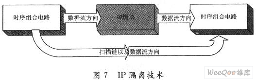通过此种方法可以有效地将一个或多个类似的IP模块与原电路软隔离开。当电路工作在非扫描状态下,数据按照正常的数据流方向流、进流出IP模块;当电路工作在扫描状态时,扫描数据绕过相应1P模块,按照相应的扫描链路径流进下级时序电路部分,实现扫描测试的功能。