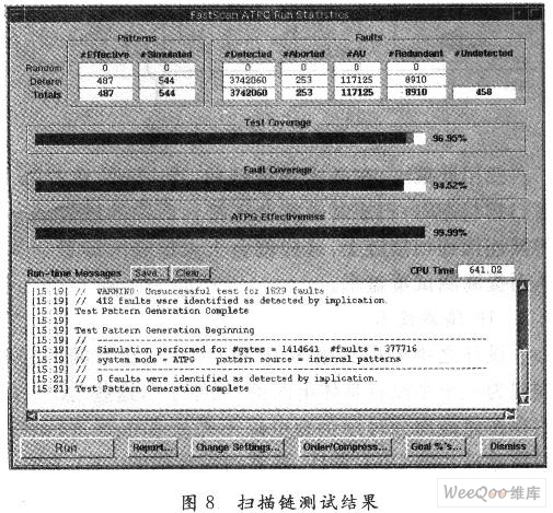 在图8所示的测试结果数据栏中,左侧的数据栏中显示的是总共生成的测试向量以及有效的测试向量数目。右侧显示的是在扫描链测试过程中能够测出的各种故障数目,其中故障覆盖率F的计算公式为: