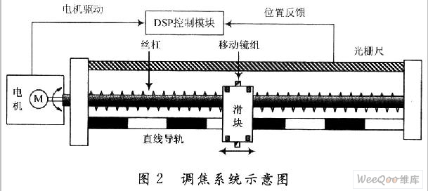整个调焦运动系统由DSP控制模块为核心的一个闭环控制系统组成,其系统示意如图2所示,主要由以下几部分组成:DSP控制模块、伺服电机、丝杠、滑动模块、精密直线导轨、直线光栅尺等。DSP模块在接受上位机的控制指令后控制电机转动,通过丝杠导轨运动机构将电机旋转运动变为移动镜组的轴向直线运动,直线位光栅尺检测镜组滑动的当前位置并反馈给DSP控制模块,DSP控制模块将移动镜组的当前位置与系统的给定位置比较,进一步控制电机带动镜组沿轴向运动,直至移动镜组到达系统给定的位置。