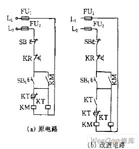 由图1 可以看出,当原电路时间继电器KT不工作时,按起动按钮SB1,KM工作,但此时因时间继电器不工作,无法断开KM电源,从而导致电机无法实现定时停机 ,产生事故。其实这种事故完全可以预防,只要在原电路KT延时断开触点处,串接KT瞬时动作的常开触点,这样,当时间继电器KT不工作时,KT瞬时动作常开触点不能闭合,KM因无电源而无法动作,从而避免了上述事故的发生。