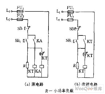 在某些负载功率小的定时电路中,采用带瞬间时动作触点的时间继电器,可使电路简单,可靠性增强,无需用别继电器,可对比图3中的两图。