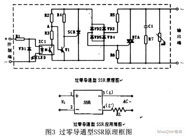 过零导通型SSR原理图和应用简图如图3所示:应用简图中1、2为控制端,加上一定大小的直流电压,输出端3、4便导通,负载便接入电源工作;当控制端电压低于一定大小时,输出端3、4立刻断开,负载停止工作。其小信号控制端和主回路在电气上是隔离绝缘的,所需控制功率极小,开关速度很快。