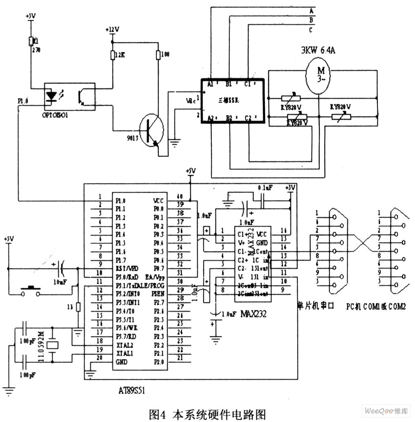 本系统受控的三相异步电机功率为3KW,额定电流为* A,故选择山东淄博其特电子公司生产的型号为3SSR30的三相固态继电器。该产品过零触发,无火花,介质耐压2500V AC,每相输出最大交流电流有效值为30A(电机直接启动瞬间电流为额定电流几倍),每相最大相电压有效值为450V,工作频率为50HZ,控制端信号必须满足电压达到4-24V DC,电流达到50mA输出端才导通。则本系统AT89S51控制电机电路图如4所示:图4中线性光耦器件OPTOISO1工作在饱和和截止状态,其性能指标CTR范围为50%-200%。晶体管9013工作在放大区,为3SSR30的导通提供足够大的输入电流。由于电机是感性负载,所以在输出回路中必须附加过流、过压抑制元件RY820V压敏电阻,用于保护SSR,它的选用原则是220V选用500V-600V压敏电阻,380V时可选用800V-900V压敏电阻。