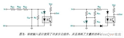 图2显示了两种输入通道设计:输入特性由RIN和RP电阻值决定;通过位于场侧的LED指示开关状态;通过R-C时间常量来实现噪声抑制;并通过光学耦合器来提供电隔离。