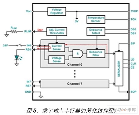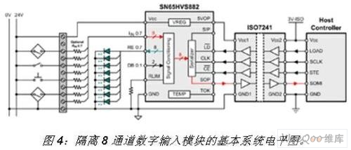 开关的“开启-关闭”状态信息由信号调节级完成电平转换和滤波,该调节级的8个并行输出均被锁存到串行器中。在外部控制器的管理下,串行器内容以串行的形式被输出。数字隔离器可以提供一个独立的接口,用于场侧DIS和控制端基于PLC或PC系统的系统控制器之间的控制和数据线路。通过将主要器件的串行输出与后面器件的串行输入连接,可以实现多个DIS器件的级联,从而获得具有高通道密度的数字输入模块设计。需要注意的是,输入电阻RIN0:7是非IEC标准设计的可选组件。零输入电阻允许具有分别为5V和4.5V的“开启”和“关闭”阈值电压的低压开关。