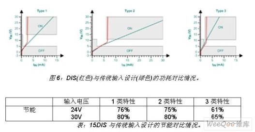 传统R-D结构的输入电流不断随输入电压成比例上升,而DIS器件的限流器可以确保“开启”状态下输入电流恒定。利用“关闭-开启”过渡点后输入电流变为独立电流,可极大降低功耗。表中列举出了三个IEC输入特性下限流输入相对于R-D输入的节能情况,其源自于图6中的输入电流图。
