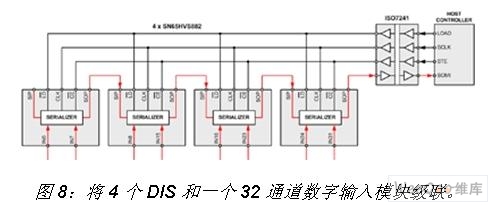 更多通道数目的模块中,空间节省甚至更加明显,如将4个DIS器件和一个32通道输入模块级联时(图8)。