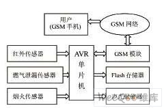 该家庭防盗报警系统主要有GSM网络模块、红外传感器、燃气泄漏传感器、烟雾传感器、ATmega128单片机、声光报警器和Flash存储器等,其系统硬件结构如图1所示。