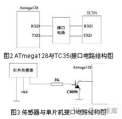 由于PC机的RS232电平与TC35i的电平不匹配,TC35i的串口通讯遵循RS232标准,所以通过串口的电平转换电路MAX232可以实现PC机与TC35i的连接通信。本系统ATmega128单片机与TC35i之间通过串行口进行通信,ATmega128与TC35i都是TTL电平,ATmega128工作电压范围是2.7"5.5V,TC35i工作电压范围是3.3"4.8V,可以直接加电阻连接,但一般要经接口电路连接,接口电路用7407缓冲/驱动芯片实现,接口电路如图2所示。