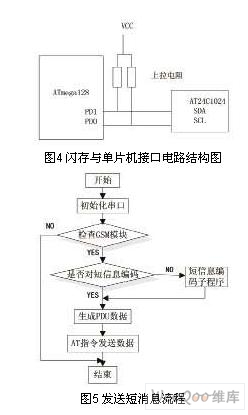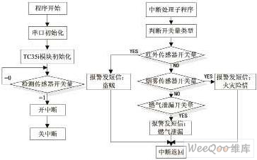 系统的软件设计采用AVR系列单片机的C语言编写,软件部分重点在于对传感器报警信号的检测和对TC35i短信模块的控制。系统主程序及中断程序流程图如图6所示。系统首先对单片机的串口、中断和TC35i短信模块初始化,ATmega128单片机不断对其余传感器接口电路的I/O口循环进行检测,当检测到有传感器的开关量为1(高电平)时,则说明需要报警,开中断进入中断处理子函数,中断处理子函数完成对相应防盗、防火、防燃气泄漏等事件的短信息发送,同时启动声光报警器。利用ATmega128通过UART0串口通信向TC35i GSM模块发送一系列AT指令,就能实现基于GSM 的短信息SMS的收发、查寻和管理。