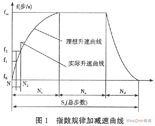 为转子转动惯量,K为假定输出转矩按直线变化时的斜率,τ为决定升速快慢的时间常数,在实际工作中由实验来确定。fm为负载转矩下步进电机的最高连续运行频率,步进电机必须在低于该频率下运行才能保证不失步。(1)式为步进电机的升速特性,由此方程可绘制出电机升速曲线。(1)式表明驱动脉冲的频率f应随时间t作指数规律上升,这样就可以在较短的时间内使步进电机的转速上升至要求的运行速度。鉴于大多数的步进电机的矩频特性都近似线性递减的,所以上述的控制规律为最佳。