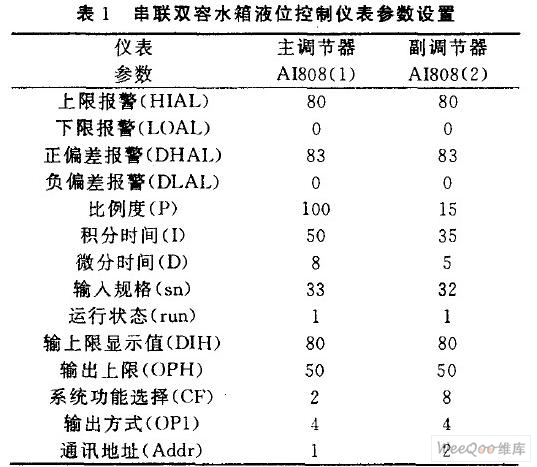 可以设置多种报警方式。仪表接热电阻输入时,采用三线制接线,消除了引线带来的误差;接热电偶输入时,仪表内部带有冷端补偿部件;接电压/电流输入时,对应显示的物理量程可任意设置。适合于温度、压力、流量、液位、湿度等的精确控制,具有控制、人工智能调节、报警、变送、通讯等功能,同时还有手动调节、手动自整定、位置比例输出等,非常适合于液位的串级控制。由低位压力传感器检测到的低位水箱压力信号经液位变送器变为标准信号后送入主调节器AI808(1)中,与液位给定值进行比较,经PID运算后,其输出作为副调节器AI808(2)的给定值,其值与高位水箱压力传感器检测到的高位水箱实际信号(同样也要经过液位变送器变为标准信号)进行比较,经PID运算后,其输出驱动电动调节阀使阀门开大或关小,从而控制低位水箱的液位在其精度范围内调节。各仪表的参数设置如表1所示。