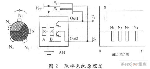 根据开关型霍尔电路原理,霍尔芯片只对一个方向的磁场有效,这就是说霍尔芯片的一个感应面为磁体的s极敏感,那么另一面一定是N极敏感,假设这两面分别叫S面和N面。将两个开关型霍尔芯片A和B的相同敏感面(例如N面)相对,A在前,B在后叠放,组成一双霍尔取样电路AB。芯片A的输出定义为Va,芯片B的输出定义为Vb,显然对来自同一方向的磁体,芯片A对S极敏感,芯片B对N极敏感,即S极触发双霍尔AB,则Va输出,N极触发AB,则Vb输出,参见图2。这种设计使取样芯片组对两个磁场方向都敏感,因芯片独立输出,具有识别磁极的能力。由于磁体组的S极、N极有位置间隔,所以Va,Vb信号在时间上不重叠。当S,N1,N2, N3,N4旋转一周顺序触发AB时,芯片A将输出一个脉冲,称之为“起始点”或零信号;芯片B将输出四个脉冲,称之为“顺序点”信号。基于这种思想设计取样电路,实现了对旋转磁体组各磁极的识别功能,尤其关键的是能确定印刷过程的起始点。